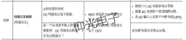 AB伺服驅(qū)動器運行中報警顯示E09母線欠壓故障,解決方法:3相電源供電時DC母線電壓低于限值在一個從電源卡軌上的軸被使能時,DC母線電壓降到欠電壓限值之下。